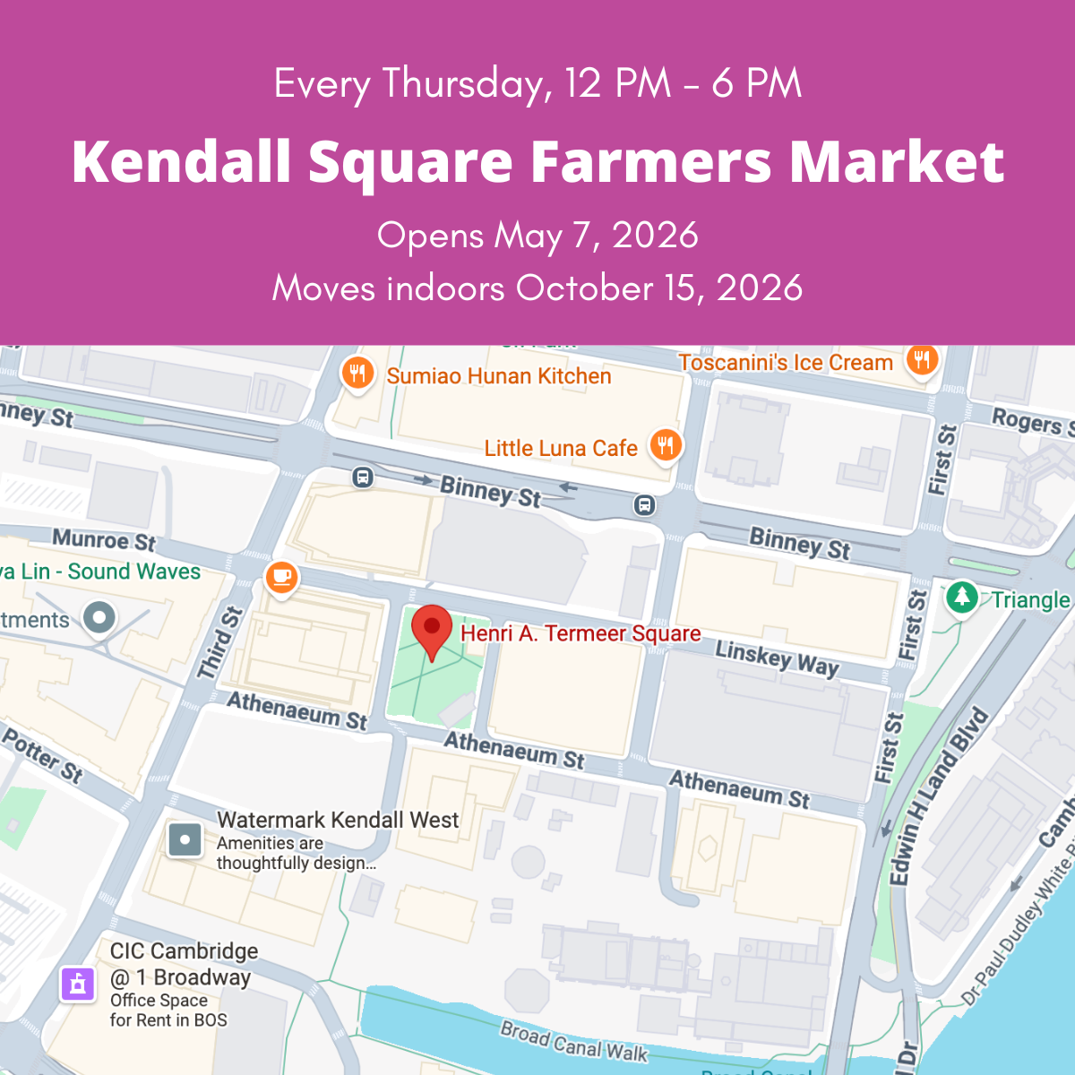 Heads Up: Kendall Square Farmers MarkET Will be in Termeer Sq in 2026